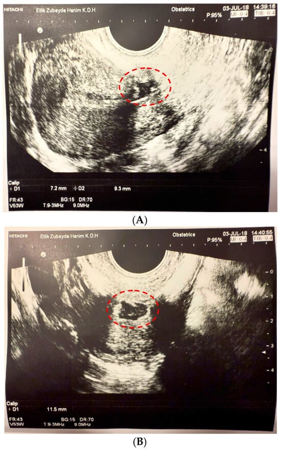 Calculation of Isthmocele Volume in Ultrasonography ((A) Height-Depth Measurement (D1*D2), (B) Width Measurement (D1)). Height-Depth Measurement is indicated as D1*D2 in panel (A), and Width Measurement is indicated as D1 in panel (B) (as described in the figure legend). The measured areas are highlighted with red circles on the images.