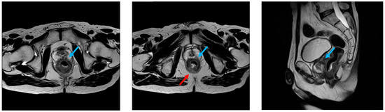 Preoperative T2-weighted MRI revealed a circumferential tumor in the lower rectum, with suspected invasion into the prostate (blue arrow) and levator ani muscle (red arrow).