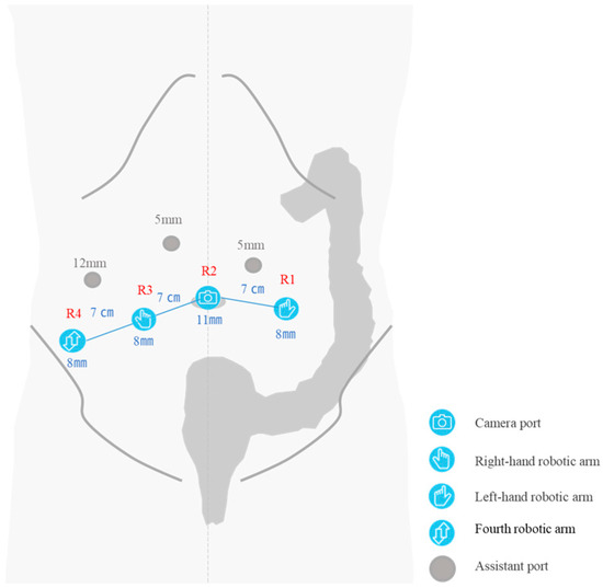 The patient was placed in the lithotomy position with a 15-degree Trendelenburg tilt. The robotic ports were inserted as shown in Figure 2. The first port (R2), an 11 mm camera port, was inserted at the umbilicus using the open technique. The R1 port was inserted at the site designated for colostomy creation, and the R3 port was inserted at the site designated for ileal conduit construction. A 12 mm assistant port with an AirSeal® trocar was employed. A polyvinyl chloride (PVC) drainage tube with a 2 mm outer diameter was inserted separately through the right abdominal wall during surgery for exudate drainage.