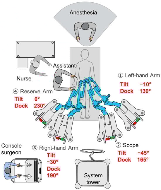 The Hugo™ RAS system was utilized. Arm carts 1 and 2 were positioned on the patient’s left side, and arm carts 3 and 4 on the patient’s right side, followed by docking with the robotic trocars. Tilt and docking angles were set at −0° and 130° for arm 1, −45° and 155° for arm 2, −30° and 190° for arm 3 and −0° and 225° for arm 4, respectively (Figure 3). The instruments used were a bipolar fenestrated grasper for arm 1, a 30° oblique-viewing laparoscope for arm 2, monopolar-curved shears for arm 3 and double fenestrated grasper for arm 4.