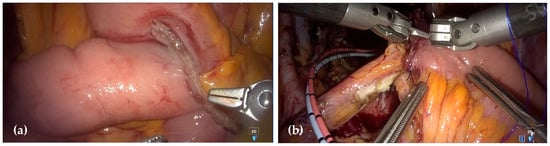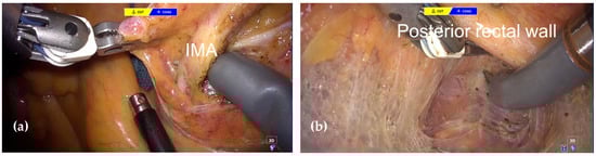 After port insertion and intraperitoneal exploration to rule out peritoneal and distant metastasis, the robotic-assisted TPE was performed. A peritoneal incision was initiated on the right side at the level of the sacral promontory, and dissection was carried into the retrorectal space. Dissection was then continued cranially to mobilize the sigmoid mesocolon and identify the inferior mesenteric artery (IMA), which was divided at its root (Figure 4a). The inferior mesenteric vein and the left colic artery were also divided at the same level. Both ureters were identified and taped, followed by mobilization toward the bladder. Dissection was carried out along the presacral fascia on the dorsal side of the rectum, reaching the supralevator space (Figure 4b).