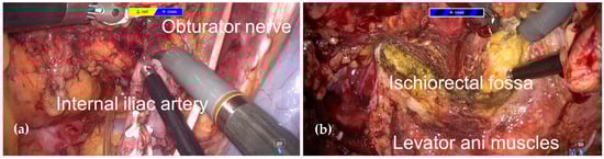 Bilateral lateral lymph node dissection was then performed. On both sides, the main trunk of the internal iliac artery (IIA) and the obturator nerve (ON) were preserved (Figure 5a). The umbilical arteries, superior vesical vessels, obturator vessels, and inferior vesical vessels were divided. Lymphadenectomy was performed for the internal iliac proximal (#263p), internal iliac distal (#263d), and obturator (#283) lymph nodes, in accordance with the Japanese Classification of Colorectal, Appendiceal, and Anal Carcinoma [5], and the levator ani muscle was exposed caudally.