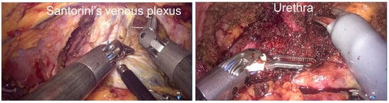 The procedure then proceeded anteriorly. The distal portion of the umbilical artery was divided, and the bladder was mobilized from the anterior abdominal wall. The space of Retzius was developed and connected with the bilateral paravesical spaces. Santorini’s venous plexus was ligated using 3-0 V-loc™ (Medtronic, Minneapolis, MN, USA) (Figure 6). The deep dorsal vein of the penis was divided and sealed with a LigaSure™ Maryland jaw device (Medtronic, Minneapolis, MN, USA). Finally, the urethra was transected using the SIGNIA™ stapling system.