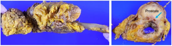 En bloc surgical specimen obtained by robotic-assisted TPE. The blue arrow indicates rectal cancer invasion into the prostate.