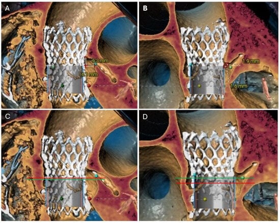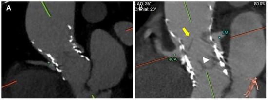 CRP is defined as the plane at the lower edge of the coronary ostia in relation to the index THV (Figure 2C,D). CRP varies depending on the native anatomy and the index prosthesis implant depth. When the NSP is below the CRP, the risk of coronary obstruction is low. However, when NSP is above the CRP, the risk of obstruction is higher. The CTA analysis should provide an assessment of this risk.