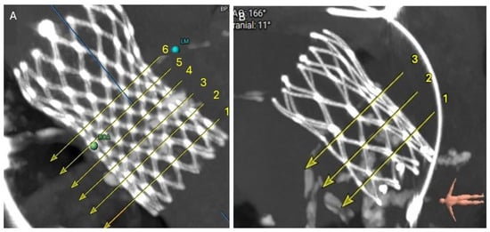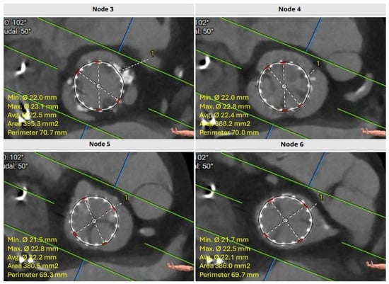 After a careful review of the native anatomy and the index THV properties, the first step would be to determine coronary alignment (Figure 1). The risk of coronary compromise is higher with coronary misalignment, and the potential for leaflet modification is also limited in that situation. It is also important to rule out leaflet thrombosis as the etiology of the prosthesis degeneration, as the treatment may differ (i.e., anticoagulation). The second step would be to measure the in vivo stent dimensions at various levels depending on the index prosthesis type. Valve-to-aorta (VTA) distance should be measured at various levels: valve-to-coronary (VTC), valve-to-Sinus of Valsalva, and valve-to-sinotubular junction (STJ; VTSTJ) (Figure 2A,B). In general, the narrowest VTA distance tends to be at the level of STJ. A VTC < 4 mm suggests a higher risk for coronary obstruction. A VTA < 2 mm suggests a high risk of sinus sequestration. Both situations are life-threatening and compromise blood flow to the coronaries. For short frame valves, it is sufficient to measure the inflow, outflow, and waist. For tall frame valves such as Evolut and NAVITOR, in addition to inflow and outflow measurements, the stent of the index prosthesis should be measured at several nodes. Nodes are visual points representative of half the length of each diamond-shaped cell on the tall frame valves. They are measured from the bottom of the valve (inflow) once the parallax is removed. Redo-TAVR valve sizing should be performed by measuring the in vivo area and perimeter at multiple levels within the frame of the valve. For example, for an Evolut valve, CTA measurements should be performed at nodes 1 to 6, understanding that the leaflets expand from node 3 to 6 (Figure 3). Depending on the implantation node, the area used for sizing is an average of that node and 3 mm below. For NAVITOR, valve measurements should be performed at nodes 1 and 2, as well as at the level of the commissural tabs (leaflets extend from node 1 to the commissural tabs). With the aforementioned information, one can choose the second prosthesis type (tall or short) and size, as well as an implantation depth to avoid coronary compromise.