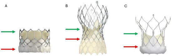 The nadir (red arrow) and top (green arrow) of the deflected leaflets in various valve flatforms. (A) For Sapien S3, the nadir of the leaflets is located 2–4 mm above the inflow, and the top of the deflected leaflets is located at the top of the commissure tab. (B) For the Evolut family valves, the nadir is located at node 3 and the top of the leaflets at node 6 (node 5 for the 23 mm valve). (C) For the NAVITOR valve, the nadir is at node 1, and the top of the leaflets is at the bottom of the commissure tab.