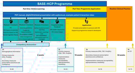 We completed a one-year longitudinal study to evaluate the self-reported effectiveness of the BASE-HCP educational programme for HCPs (see Figure 1). Participants provided data at four timepoints via the online software Qualtrics (Provo, UT, USA, December 2022): baseline (T1), immediately post-online theoretical learning (T2), post-application with clients (T3; approximately 16 weeks after T2), and at 12-month follow-up (T4). We designed this study to assess changes in HCPs’ confidence, knowledge, and attitudes towards the remote delivery of evidence-based exercise programs for individuals with multiple sclerosis (MS) and implementation outcomes according to Proctor et al.’s framework [30].