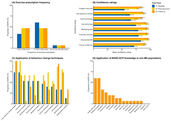 Changes in secondary outcomes of complete-case HCPs (n = 15) from baseline (T1) to post-application (T3) and to follow-up (T4). (A) Frequency of exercise prescription across MS clients in routine clinical practice. (B) Confidence ratings for remote exercise prescription to MS clients. (C) Application of behaviour change techniques in routine clinical practice. (D) Application of BASE-HCP knowledge to non-MS clients in routine clinical practice (assessed only at T4). Horizontal bars indicate M (SD) data; vertical bars indicate Proportion of HCP (%) data.