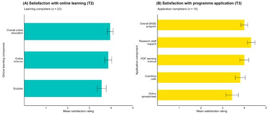 Acceptability of the BASE-HCP programme. (A) HCP satisfaction with the online learning component. (B) HCP satisfaction with the application component. Bars indicate M (SD) data.