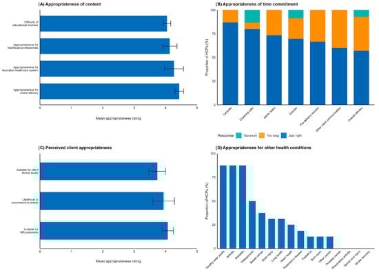 Appropriateness of the BASE-HCP programme. (A) Appropriate of content. (B) Appropriateness of time commitment. (C) Perceived client appropriateness. (D) Appropriateness of the programme for application to other health conditions. Horizontal bars indicate M (SD) data; vertical bars indicate proportion of HCP (%) data.