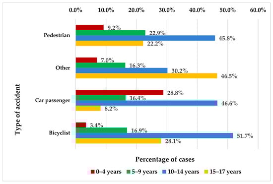 Children aged 0 to 4 years were most commonly involved as car passengers, significantly more than as pedestrians, cyclists, or participants in other types of injuries (28.8% compared to 9.2%, 7%, and 3.4%, respectively). In contrast, adolescents aged 15 to 17 years were more often injured in other types of injuries or while cycling than as pedestrians or vehicle passengers (46.5% and 28.1% versus 22.2% and 8.2%, respectively) (p < 0.001) (Figure 1).