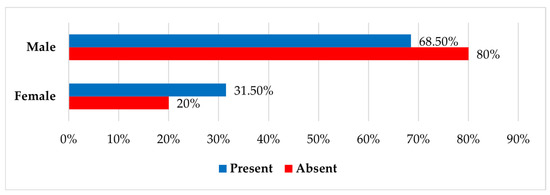 There was a statistically significant difference in the distribution of sex across residential settings (p = 0.005), with a higher proportion of male patients in rural areas compared to females (79.5% vs. 63.7%), and a higher proportion of females in urban areas compared to males (36.3% vs. 20.5%).