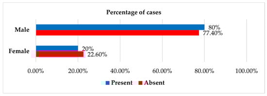 Thoracic contusion rates did not differ significantly across injury categories (p = 0.11) (Table 3). Nevertheless, a statistically significant difference (p = 0.04) was observed when classified by sex, with females experiencing thoracic contusions at a higher rate than males (31.5% vs. 20%) (Figure 2 and Table 4).