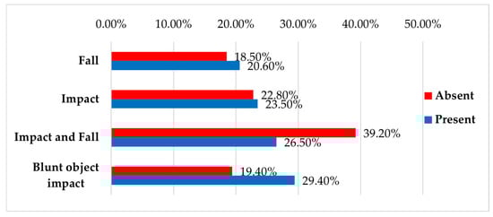 Injury categories were standardized for consistency and included excoriations, defined as superficial skin abrasions not involving deeper tissue; thoracic contusions, referring to chest wall soft tissue injuries (bruising of skin, subcutaneous tissue, and musculature) without confirmed internal organ involvement such as pulmonary or cardiac contusions; abdominal contusions, encompassing both abdominal wall soft tissue injuries and, when applicable, internal organ contusions involving the liver, spleen, or other abdominal viscera; additional fractures, representing bone fractures beyond the primary injury, either multiple fractures within the same limb or simultaneous fractures in different anatomical regions; traumatic brain injuries (TBIs), including documented concussions, intracranial hemorrhage, or skull fractures confirmed by clinical or imaging evaluation; limb contusions, characterized as localized bruising of the extremities without associated fracture; and hematologic alterations, defined as blood count abnormalities, primarily decreases in hemoglobin and hematocrit indicative of blood loss.