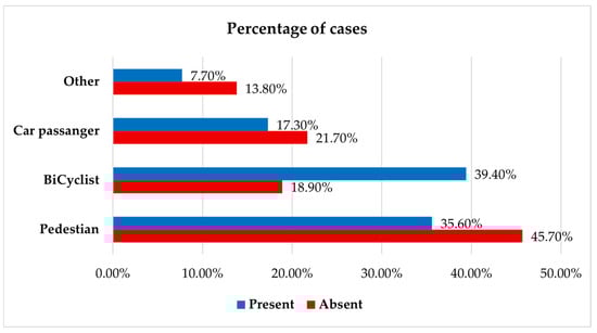 Patients injured as cyclists exhibited excoriations at a markedly higher rate than other groups (39.4% versus 18.9%; p = 0.001) (Figure 5).