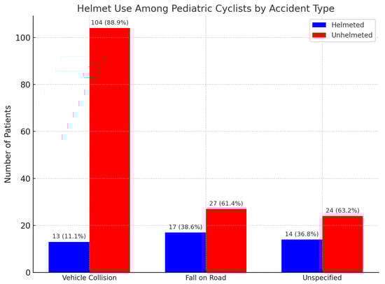 In regard to bicycle safety and helmet use, we determined that 78% of the 199 pediatric cyclists were not wearing helmets at the time of injury. Among the 111 patients injured from vehicle collisions, only 11.1% wore helmets. For the 46 children who experienced injury after road falls, 30.4% had helmets, while 40.0% of those in the unspecified group (n = 42) were helmeted. This underlines a critical area of safety policy failure. Mitchell and Bambach have shown that helmet use significantly reduces pediatric cyclist injuries, including TBIs [47]. International studies have reported markedly higher rates of traumatic brain injury (TBI) among pediatric cyclists without a helmet, often exceeding 10–15% in severe crashes [44,47], highlighting the likely underestimation of neurological burden in our cohort and reinforcing the critical role of helmets in mitigating head trauma.