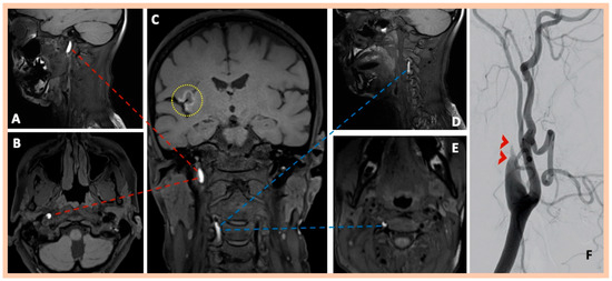 Figure 1. Neuroimaging findings—Patient #1. Three-dimensional fat-saturated black-blood T1-weighted high-resolution (3 Tesla) vessel wall imaging with multiplanar reconstruction, showing a characteristic (crescent-shaped), hyperintense lesion in the vessel wall of the right internal carotid artery, indicating intramural hematoma (Panels (A): Sagittal—(B): Axial—(C): Coronal; red dotted lines). Moreover, an asymptomatic spontaneous dissection with intramural hematoma along the distal intraforaminal (V2) segment of the right vertebral artery was detected using the same MR sequence (Panels (C): Coronal—(D): Sagittal—(E): Axial; blue dotted lines). The subacute right middle cerebral artery infarction is also depicted in the T1-weighted SPACE images. (Panel (C)—yellow circle with dotted lines). Digital subtraction angiography confirmed the right ICA dissection, revealing a “flame-shaped” occlusion (Panel (F)).