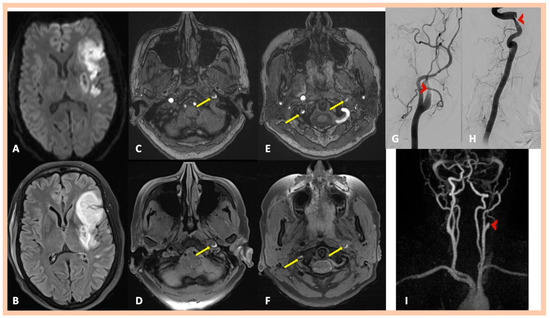 Figure 2. Neuroimaging findings—Patient #2. High-resolution 3 Tesla brain MRI showing a left middle cerebral artery infarction (Panel (A): diffusion restriction in axial DWI sequence; Panel (B): hyperintense signal in axial FLAIR imaging). Double lumen and intraluminal hematoma along the left ICA are depicted in Time-of-Flight (TOF) MRA (Panel (C)) and 3D fat-saturated black-blood T1-weighted high-resolution (3 Tesla) vessel wall imaging (Panel (D)), respectively. An asymptomatic spontaneous dissection with double lumen and intramural hematoma along the V3 segment of the right vertebral artery was also detected using the same MR sequences (Panel (E): TOF MRA—Panel (F): 3D fat-saturated black-blood T1 SPACE). Digital subtraction angiography confirmed the left ICA dissection, revealing a “flame-shaped” occlusion (Panel (G)) and also revealed focal stenosis (approximately 80%) along the V3 segment of the right vertebral artery, indicative of intramural hematoma (Panel (H)). MRA showing the left ICA occlusion as well (Panel (I)).
