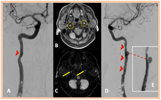 Figure 3. Neuroimaging findings—Patient #3. Three-dimensional fat-saturated black-blood T1-weighted high-resolution (3 Tesla) vessel wall imaging, showing crescent-shaped, hyperintense lesions in the vessel walls of the right and left ICA (Panel (A)), indicating intramural hematoma. Characteristic crescent- or ring-shaped lesions with DWI restriction are detected along the affected segments of the ICA bilaterally (Panel (B)). Digital subtraction angiography showing focal stenosis along the extracranial segment of the right ICA, indicative of intramural hematoma (Panel (C)), and long tapered stenosis along the extracranial left ICA (Panel (D)), with the presence of a dissecting aneurysm (Panel (E)).