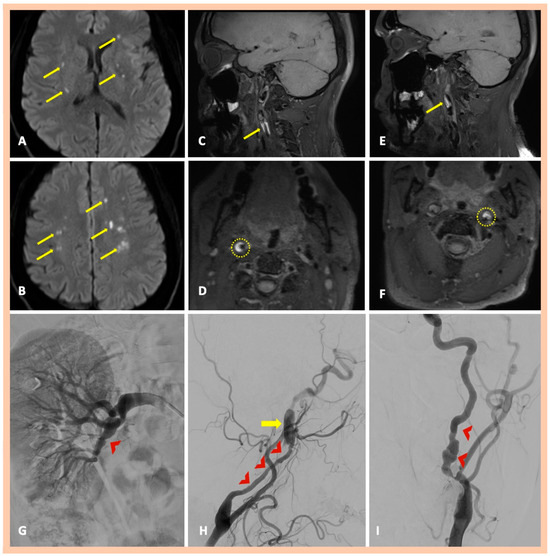 Figure 4. Neuroimaging findings—Patient #7. DWI sequence revealing multiple acute ischemic lesions with diffusion restriction in multiple arterial territories bilaterally (Panels (A,B)). Three-dimensional fat-saturated black-blood T1-weighted high-resolution (3 Tesla) vessel wall imaging with multiplanar reconstruction, showing crescent-shaped, hyperintense lesions in the vessel wall of the right ICA (Panels (C): Sagittal—(D): Axial) and left ICA as well (Panels (E): Sagittal—(F): Axial), indicating intramural hematoma along both arteries. DSA revealing the characteristic focal stenosis of the right renal artery (Panel (G)) and the characteristic “string-of-beads” appearance along the extracranial segments of the right (Panel (H)) and left ICA (Panel (I)) with the presence of a dissecting aneurysm along the distal cervical and proximal petrous artery segments of the right ICA (Panel (H); yellow arrow).