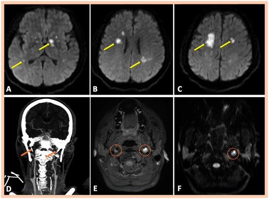 Figure 5. Neuroimaging findings—Patient #10. DWI sequence revealing multiple acute ischemic lesions with diffusion restriction in bilateral anterior circulation territories (Panels (AC)). Computed tomography of the neck and brain revealed elongated styloid processes of the stylohyoid ligaments bilaterally (Panel (D)). Three-dimensional fat-saturated black-blood T1-weighted high-resolution (3 Tesla) vessel wall imaging showing crescent-shaped, hyperintense lesions in the vessel wall of the right ICA in the subacute phase (Panel (E)) and of the left ICA in the acute phase (Panel (E)). A characteristic crescent- or ring-shaped lesion with DWI restriction is detected along the affected segment of the left ICA (Panel (F)).