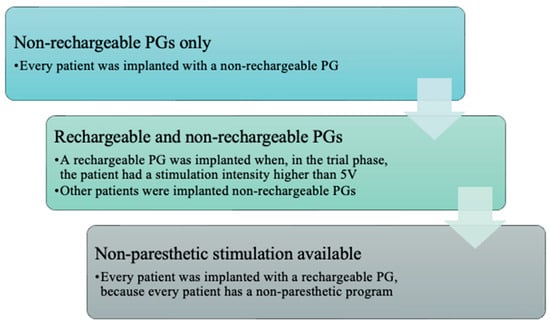 In earlier cases, only non-rechargeable PGs were implanted, as rechargeable devices were not yet available at our center. As newer stimulation modalities became accessible, a series of implantation protocols were developed and approved by a multidisciplinary committee, including anesthesiologists, neurologists, neurosurgeons, neurophysiologists, and rehabilitation specialists. These protocol changes are summarized in Figure 1. At present, all patients receive rechargeable PGs since 2017, regardless of the type or intensity of stimulation used during the trial phase. This practice has been adopted because all patients are ultimately programmed with non-paresthetic stimulation programs, even if tonic stimulation is also included in their treatment settings.