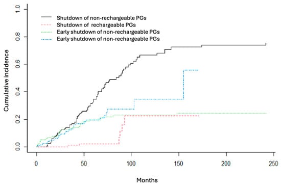 A competing risk analysis was conducted to exclude all PGs that were explanted for reasons unrelated to battery depletion. The probability of shutdown, when comparing the battery life of rechargeable versus non-rechargeable PGs, was found to be statistically significant throughout the entire follow-up period, up to 150 months (p < 0.05). In contrast, the probability of early shutdown remained comparable between both groups over the same period (p = 0.45). Detailed data on shutdown and early shutdown probabilities are presented in Table 2 and Table 3, respectively. The competing risk analysis is illustrated in Figure 2.