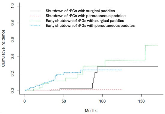 When the comparison between surgical and percutaneous paddles was restricted to rechargeable PGs, only six devices had failed by the end of follow-up. The probability of shutdown showed a temporal trend, with earlier failure in PGs connected to surgical paddles compared to those with percutaneous leads (0.02 vs. 0.01 at month 50, 0.28 vs. 0.01 at month 100, and 0.28 vs. 0.01 at month 125); however, this difference did not reach statistical significance (p = 0.22). Similarly, the competing risk analysis revealed no significant difference between groups for early shutdown (p = 0.79). A detailed comparison of PG battery life by paddle type is presented in Table 4 and Table 5, and illustrated in Figure 3.