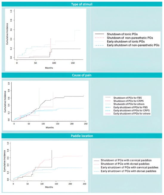 The competing risks analysis was also repeated across different lead types, stimulation modalities, and other variables to assess their potential impact on PG longevity. A p-value of <0.05 was considered statistically significant.