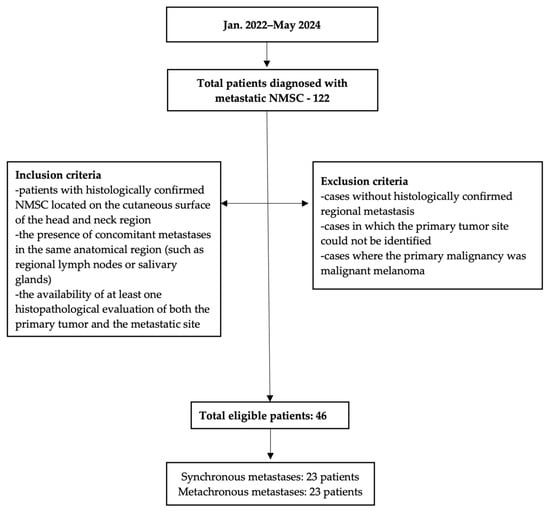 Inclusion criteria were as follows: patients with histologically confirmed NMSC located on the cutaneous surface of the head and neck region, the presence of concomitant metastases in the same anatomical region (such as regional lymph nodes or salivary glands), and the availability of at least one histopathological evaluation of both the primary tumor and the metastatic site. Exclusion criteria included cases without histologically confirmed regional metastasis, cases in which the primary tumor site could not be identified, and cases where the primary malignancy was malignant melanoma.