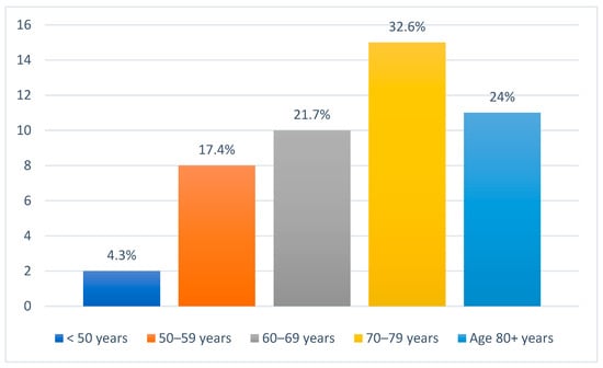 There were 46 patients diagnosed with metastatic NMSC of the head and neck region. Of these, 36 (78.3%) were male and 10 (21.7%) were female. A significant proportion of patients, 31 (67.4%), originated from rural areas, while only 15 (32.6%) were from urban settings. Age distribution revealed that the most affected age group was 70–79 years, comprising 15 patients (32.6%). Patients aged 60–69 years accounted for 10 cases (21.7%), while those aged 80 years or older represented 11 cases (24%). Additionally, 8 patients (17.4%) were between 50 and 59 years old, and only 2 patients (4.3%) were younger than 50 years (Figure 2). In terms of metastatic behavior, 23 patients (50%) presented with synchronous metastases while the other half (50%) developed metachronous metastases (Table 1).