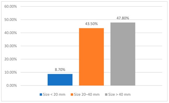Among the 23 patients presenting with synchronous metastases, the predominant site of the primary tumor was the lower lip, identified in 78.3% (n = 18/24) of cases, followed by a subset of patients (13%, n = 3/23) exhibiting extensive tumors affecting multiple anatomical areas and the cheek region in 8.7% (n = 2/24). Tumor size was significant, with 47.8% (n = 11/24) of lesions measuring greater than 40 mm, 43.5% (n = 10/24) between 20 and 40 mm, and 8.7% (n = 2/24) were under 20 mm (Figure 3). All cases were diagnosed as cSCC (100%, n = 23/23).