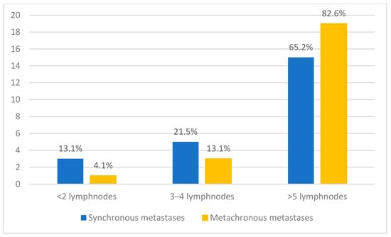 Distribution of patients according to the number of lymph nodes involved, comparing synchronous and metachronous metastases.