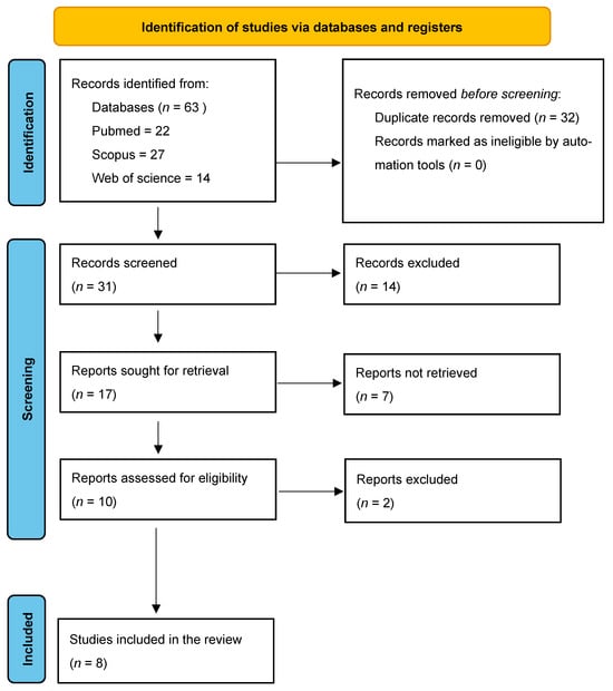 The search yielded 63 publications, and after removing 32 duplicates, 31 studies were identified for screening. After a subsequent screening of titles and abstracts, 14 studies were excluded because they did not meet the predefined inclusion criteria (e.g., incorrect study design, lack of structured methodology, or failure to address infection prevention and control in the context of COVID-19), and eight studies were selected for full-text review (Figure 1).