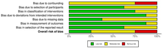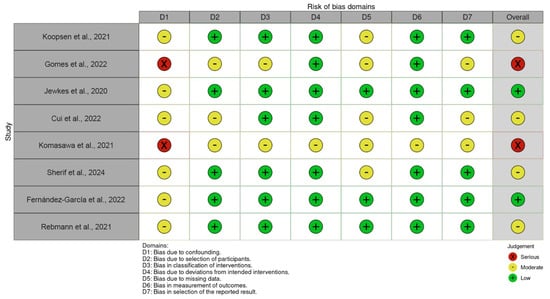 For each study, an overall assessment of risk of bias was made based on the highest level of bias found in a domain. The assessments were categorised as low, moderate, severe, or critical risk of bias (Figure 2).