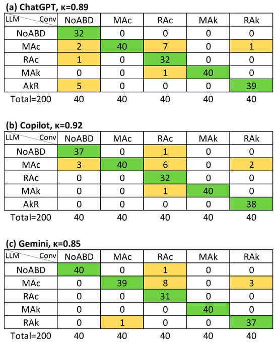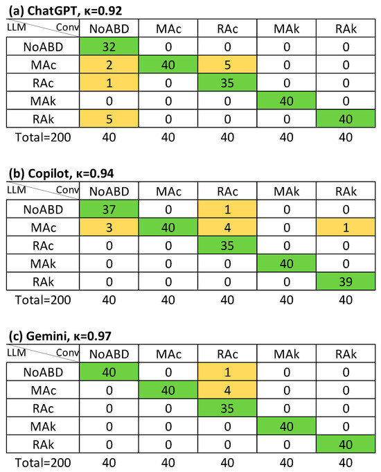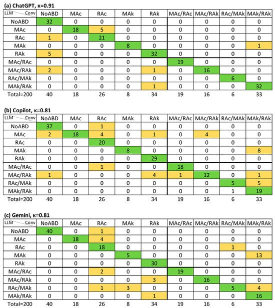 Agreement (Cohen’s κ value) on primary disorder between LLM-assisted with supervision and conventional method even if it appeared as a secondary disorder. (APD-a): (a) ChatGPT; (b) Copilot; (c) Gemini. Conv, conventional evaluation (column titles), LLM, large language model assisted evaluation (row titles). NoABD, no acid–base disorder. MAc, metabolic acidosis; MAk, metabolic alkalosis; RAc, respiratory acidosis; RAk, respiratory alkalosis. Cells indicate agreement frequencies: green = concordant cases, orange = discordant cases.