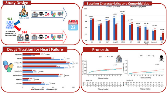 It shows the study design and main results regarding comorbidities, left ventricular remodelling, and prognosis in both cohorts. The results for the cohort followed by a nurse specialising in heart failure are shown in blue, and the results for the cohort without follow-up by a nurse specialising are shown in red. Acronyms: ACEI: angiotensin-converting enzyme inhibitors; AF: atrial fibrillation; ARB: angiotensin receptor blockers; ARNI: angiotensin receptor–neprilysin inhibitors; CKD: chronic kidney disease; CR: cardiac rehabilitation; DLP: dyslipidaemia; DM: diabetes mellitus; HBP: high blood pressure; MRA: mineralocorticoid receptor antagonists; NSHF: nurse specialising in heart failure; SGLT2i: sodium glucose co-transporter type 2 inhibitors.