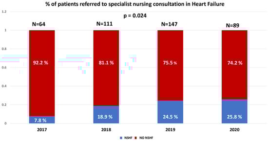 Percentage of patients referred to specialist nursing consultation in heart failure in our centre. Acronyms: NSHF: nurse specialising in HF.
