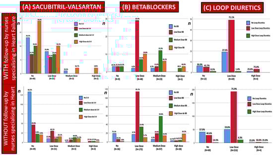 By the end of the follow-up period, patients with HFrEF followed by NSHF had achieved better optimisation and titration of disease-specific treatment (Table 3). There was a higher prescription of angiotensin receptor–neprilysin inhibitor (+31.7% vs. +23.3%; p = 0.001), β-blockers (+2.4% vs. −5.8%; p = 0.001), and sodium glucose co-transporter type 2 inhibitors (+24.7% vs. +17.8%; p = 0.001) than in Cohort 2. There was also a greater reduction in the use of loop diuretics (−16.5% vs. −6.7%; p = 0.001) and thiazide diuretics (−10.5% vs. +3.3%; p = 0.044). There were no differences in the prescription of drugs such as ivabradine, mineralocorticoid receptor antagonists, or digoxin. Figure 3 shows that patients treated by NSHF who are not receiving an angiotensin receptor–neprilysin inhibitor, or who are receiving a low dose initially, undergo a higher level of titration by the end of the follow-up period than those not cared for by NSHF (Figure 3A). A similar trend is observed with β-blockers (Figure 3B), with a clear reduction in the dose of loop diuretics and withdrawal (Figure 3C).