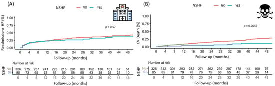 (A) Kaplan–Meier curve of time to readmission for HF in patients followed up by a nurse specialising in heart failure and those with conventional follow-up. (B) Kaplan–Meier curve of time to cardiovascular mortality in patients followed up by a nurse specialising in heart failure and those with conventional follow-up. Acronyms: CV: cardiovascular; NSHF: nurse specialising in HF.