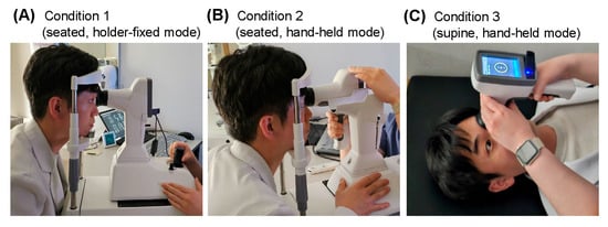 Total ocular wavefront aberrations were assessed using the Ovitz xwave Hartmann–Shack aberrometer. Cycloplegia was induced using a drop of 0.5% tropicamide combined with 0.5% phenylephrine in both eyes, and measurements were performed one hour later after confirming pupil dilation of at least 6 mm. Each eye underwent five consecutive measurements under three different conditions: a seated position using the holder-fixed mode (Condition 1), a seated position using the hand-held mode (Condition 2), and a supine position using the hand-held mode, immediately after reclining (Condition 3) (Figure 1). A 10 min interval was offered between each condition. The inclusion of the seated hand-held mode allowed for assessment of potential variability induced by the hand-held mode.