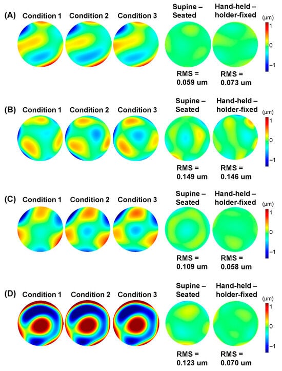 HOA wavefront maps under three conditions and their differences with RMS values. Four representative cases are shown under three different conditions ((1) seated position with holder-fixed mode, (2) seated position with hand-held mode, (3) supine position with hand-held mode) and their differences (supine–seated, hand-held–holder-fixed): (A) a 37 year old emmetropic female with no history of ocular surgery, (B) a 37 year old male with high myopia (SE < −10 D) and no history of ocular surgery, (C) a 25 year old female who underwent SMILE 4 years ago, and (D) a 41 year old female who underwent LASIK 25 years ago. No significant changes in HOAs were observed.