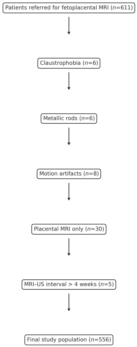 Flow chart of patient selection for the study. A total of 611 patients were referred for fetoplacental MRI. Exclusions included claustrophobia (n = 6), metallic rods (n = 6), motion artifacts (n = 8), placental MRI only (n = 30), and MRI–US interval > 4 weeks (n = 5). The final study population comprised 556 patients.