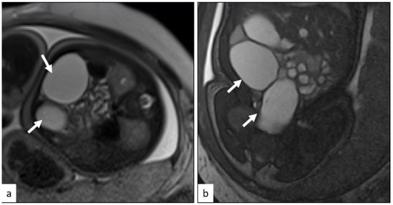 - Hugele, F.; Dumont, C.; Boulot, P.; Couture, A.; Prodhomme, O. Does prenatal MRI enhance fetal diagnosis of intra-abdominal cysts? Prenat. Diagn. 2015, 35, 669–674. [Google Scholar] [CrossRef] [PubMed]