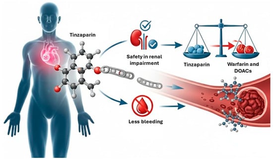 Renal function is also critical. Tinzaparin does not accumulate in patients with renal insufficiency, even in severe cases, and does not require dose adjustments. This contrasts with some DOACs, which need dose adjustments or are contraindicated in severe renal insufficiency [20,34].
