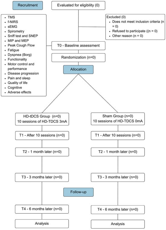 This is a multicenter, parallel, controlled, randomized, triple-blind clinical trial following the criteria set by the Consolidated Standards of Reporting Trials (CONSORT) [33] and Standard Protocol Items Recommendations for Interventional Trials (SPIRIT) (Figure 1) [34]. The study will be conducted between 2025 and 2027 at three leading research centers. The purpose is to analyze the effects of HD-tDCS on the primary diaphragmatic motor cortex in subjects with a clinical diagnosis of ALS.