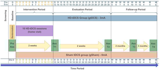 Participants will be reassessed after 10 sessions/two weeks of intervention (T1), one month after the start of the intervention (T2), three months after the intervention (T3), and six months after the end of the interventions (T4). At each session, monitoring will be conducted to assess any side effects or adverse events, or freely through phone calls if the participant finds it necessary. Adverse events will be considered as any unfavorable medical occurrence in a participant, including any abnormal sign, symptom, or disease temporarily associated with the participant’s involvement in the research. No changes will be made to any ongoing standard clinical treatment. The intervention that the gtDCS group will receive consists of 10 tDCS sessions, 5 times per week, over two consecutive weeks, with each session lasting 32 min (Figure 2).