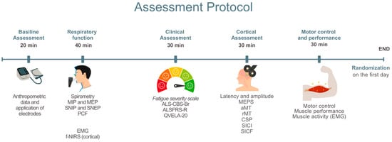 Baseline assessment. MIP: Maximum Inspiratory Pressure; MEP: Maximum Expiratory Pressure; SNIP: Sniff Nasal Inspiratory Pressure; SNEP: Sniff Nasal Expiratory Pressure; PCF: Peak Cough Flow; sEMG: Surface Electromyography; NIRS: Near-Infrared Spectroscopy; fNIRS: Functional Near-Infrared Spectroscopy; ALS-CBS-Br: Amyotrophic Lateral Sclerosis Cognitive Behavioral Screen; ALSFRS-R/BR: Revised Amyotrophic Lateral Sclerosis Functional Rating Scale—Brazilian Version; QVELA-20/Br: Short Specific Quality of Life Questionnaire for ALS Patients; MEP: Motor Evoked Potential; aMT: Active Motor Threshold; rMT: Resting Motor Threshold; CSP: Cortical Silent Period; SICI: Short-Interval Intracortical Inhibition; SICF: Short-Interval Intracortical Facilitation.