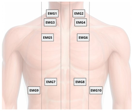 Placement of 10 surface electromyography (sEMG) electrodes on respiratory muscles: scalene (EMG1 and EMG2), sternocleidomastoid (EMG3 and EMG4), parasternal (EMG5 and EMG6), and hemidiaphragms (EMG7 to EMG10), bilaterally positioned according to SENIAM guidelines.